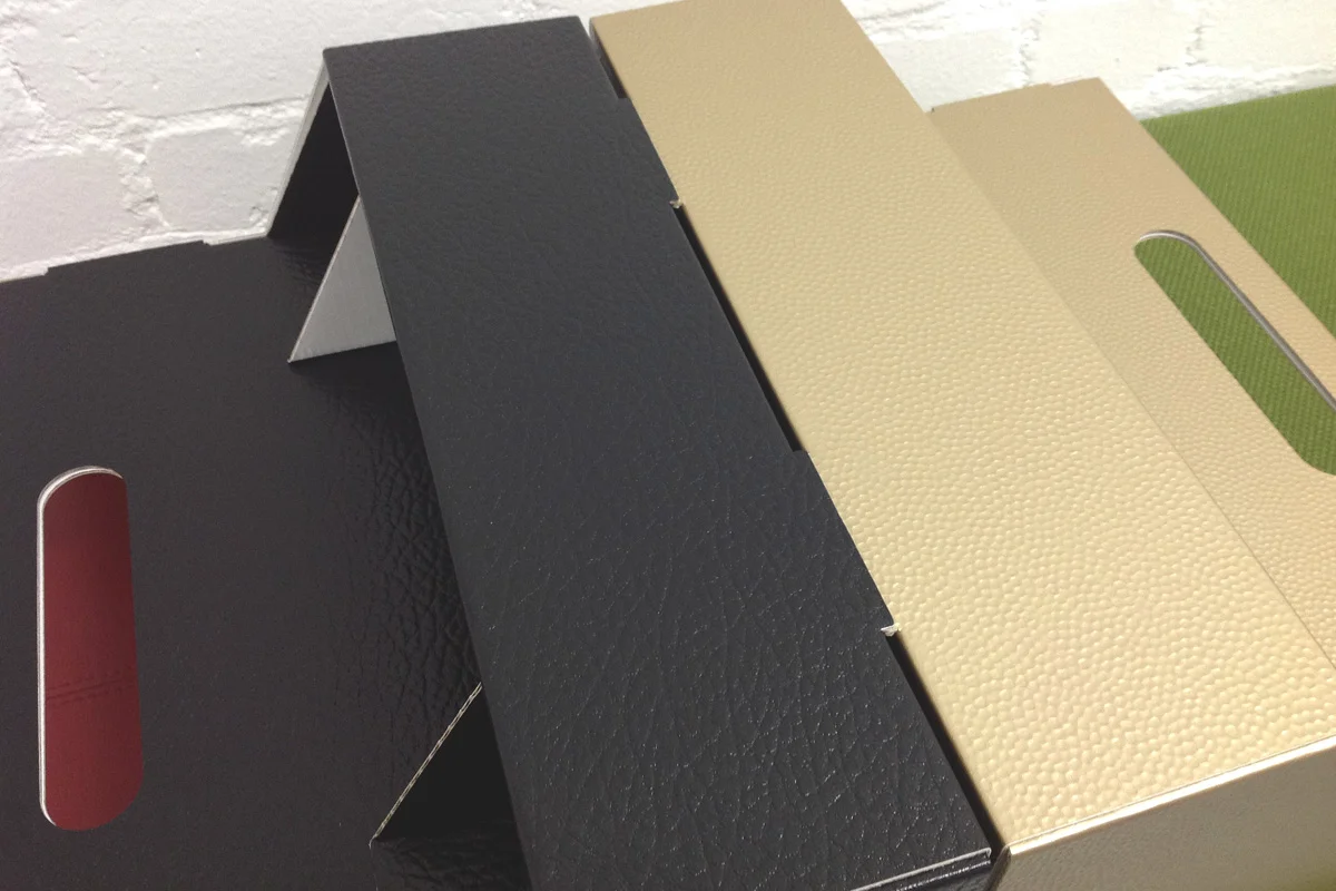 Some of the materials we use have certain textures to them, like the two below, the black grained leather and metal x gold papers.